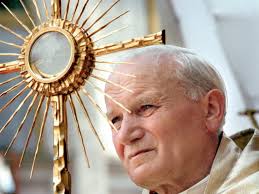 Az Eucharisztia másik nagy szentje: Szent II. János Pál pápa (akinek vezetése alatt adta a katolikus egyház eddig nem látott intenzitással tárja elénk a köztünk lévő Jézust, a szentségimádásokat). Ő így írt, amikor elrendelte az Oltáriszentség évét: „Az Egyház az Eucharisztiából él. …