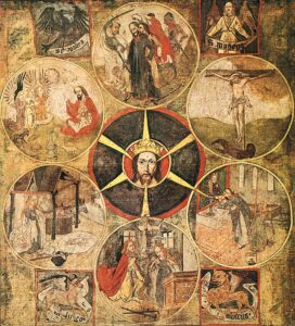 A képen látunk még több jelképet, mint az irgalmasság cselekedeteit, az evangélistákat….