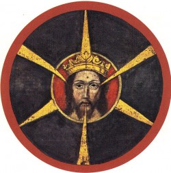 A középső arc az isteni Titkot és fenséget jelképezi, és természetesen Jézus arcát látjuk, Jézuson keresztül látjuk az isteni Titkot. Ahogy Jézus mondta: Aki engem lát, látja az Atyát.
