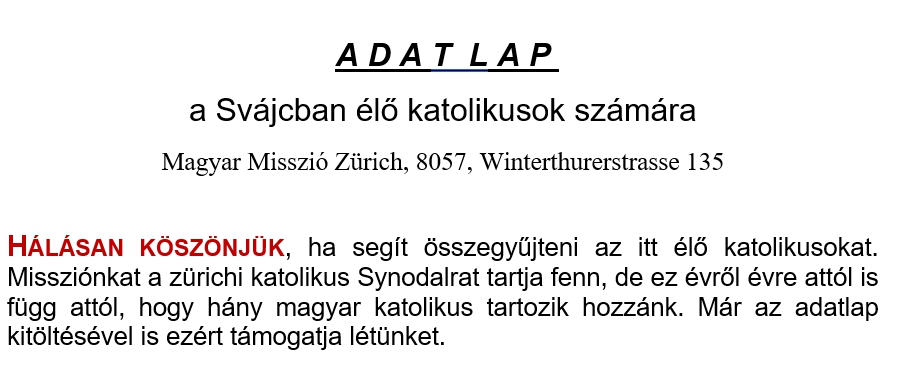 I. Örülnénk, ha minden itt élő magyar katolikust missziónk és közösségünk tagjai között tarthatnánk számon. Ennek érdekében kérjük adatlapunk kitöltését (az adatokat nem adjuk tovább, és nem jár tagsági díjjal mint egy egyesületnél, hiszen mi egyházon belüli közösség vagyunk).