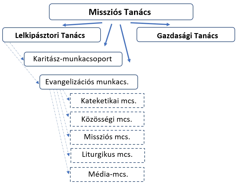 Testületünk megújult szabályzatában a Missziós Tanács bizottságokra oszlik. Az alábbi organigramm egy lehetséges felépítést mutat. Ebből azokat valósítjuk meg, amely feladatokban a kedves hívek jelöltjei szívesen munkálkodnak. A megválasztott tanácstagok alkotják a bizottságokat, amelyeket szeretnénk választás nélkül is bárkivel kibővíteni a hívek közül, így a bizottságok munkacsoportokká válnak. A folytatásban az egyes területekkel részletesebben foglalkozunk.