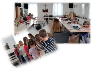 A gyerekek életkor szerint három csoportba osztva tanulnak az erre az alkalomra osztályteremnek berendezett gyülekezeti helyiségekben. Az asztalok természetesen körben vagy U-alakban vannak elrendezve, így az otthon megszokott frontális előadásmód helyett mindenhol csoportos foglalkozás zajlik. A legkisebbeket tanító Demeter Andrea elmondta, hogy a csoportjában tanuló 12 gyerek közül mindössze négy olyan van, akinek mindkét szülője magyar. A többiek két- vagy három nyelvű családból származnak, ahol nem a magyart használják a legtöbbet otthon, így a gyerekek szókincse is szűkösebb. Andrea óráin Meixner Ildikó diszlexiaprevenciós olvasástanítását alkalmazza, rengeteg interaktív játékkal, rajzolással, színezéssel téve átélhetővé a betűk megismerését a gyerekek számára.