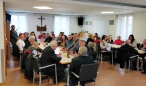 Egyedül nem lehet kereszténynek lenni, szüksége van mindenkinek egy közösségre. Az is túl kevés, hogy csak egy-egy szentmisén együtt legyek valakivel. Egyik célunk tehát, hogy a kedves testvérek megtalálják a helyüket valamilyen rendszeres közösségi együttlétban. Már a szentmisék utáni aperó (kávézás, borozás, üdítőzés…) is jó alkalom erre, és nagy öröm tölt el bennünket, hogy hol kevesebben, de inkább többen kihasználják ezt az alkalmat. A látható képen kívül még van más kisebb termünk is, tehát mindenkit szeretettel várunk!